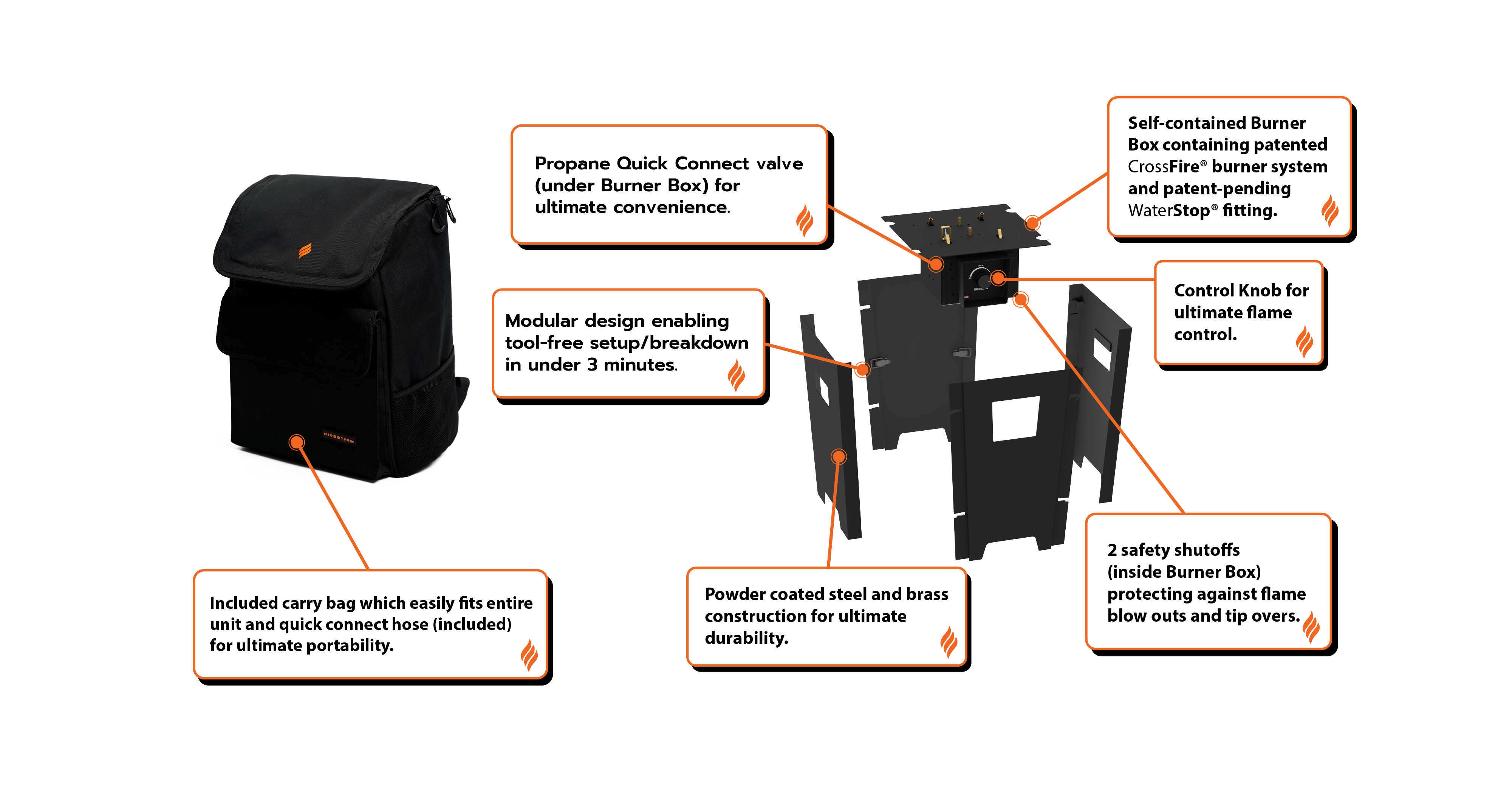 The heart of every Live Outdoor product is our patented CrossFire® burner system. Designed and made in America by our team of fire fanatics, the CrossFire® burner system truly disrupted the market and is now the standard by which performance and durability are measured. This revolutionary technology utilizes the Venturi Effect—a scientific principle that mixes gas and air at a precise ratio to create a taller, brighter, and fuller flame. The result? A fire that looks and feels like a natural wood-burning flame while using significantly less gas than traditional burners. The CrossFire® system delivers unmatched performance, producing the most natural-looking flames in the industry.